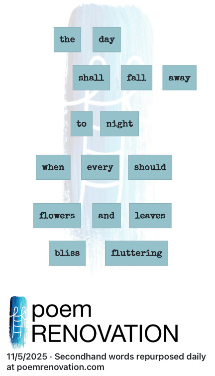 And so, with faith restored, I return to my hopequesting pursuit. On Wednesday, my morning poemRENOVATION was crafted from Emily Brontë’s Fall, leaves, fall. I can still feel the bliss fluttering.